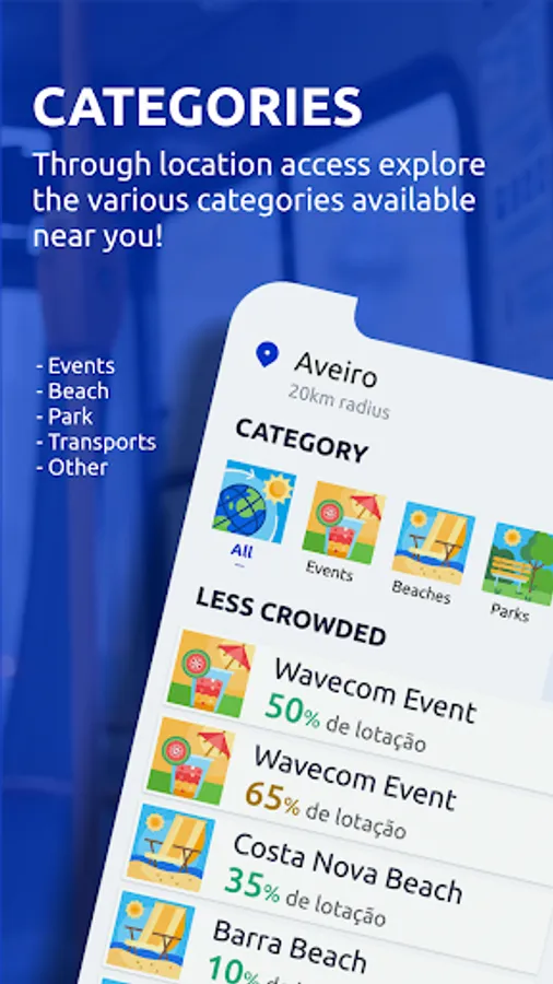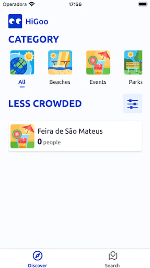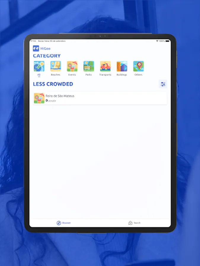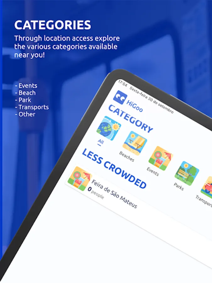 HiGoo is a mobile application with the purpose of listing and registering the presence of people in various areas of the world. The user who downloads the application will have prior knowledge about the capacity of each place. They will be able to choose the category they want and these will be spread among events, beaches, parks, buildings, vehicles, among others. Through geolocation, HiGoo tells you where you can go with fewer people and you can change that distance radius in a single click.