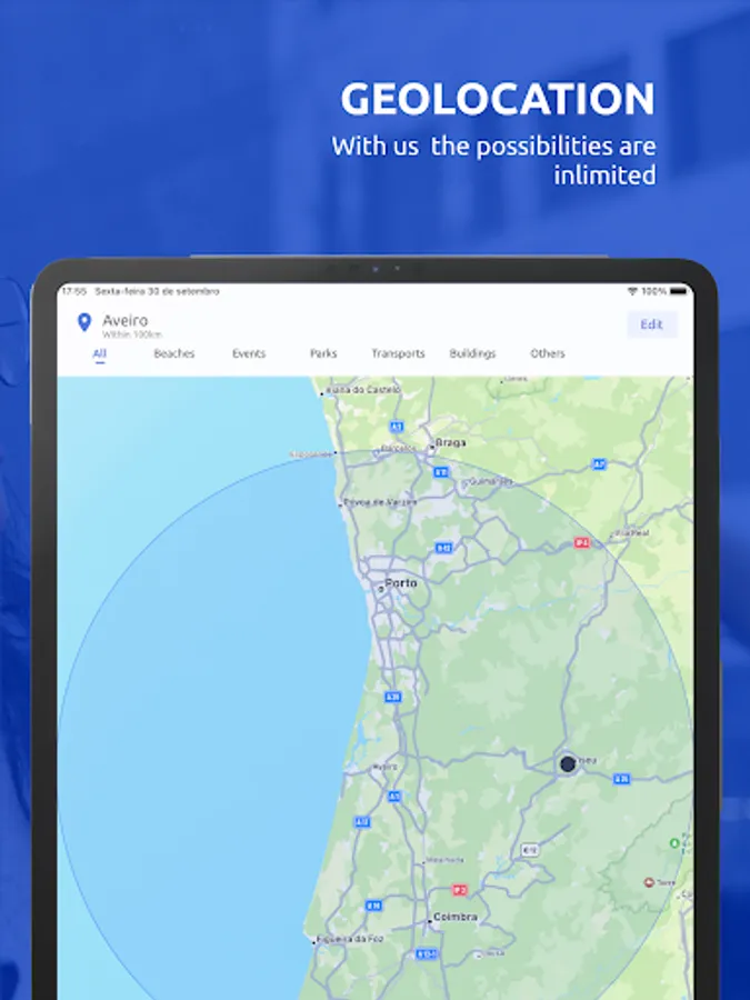 Enter your area through our categories (event, beach, park, buildings, vehicles, among others). On our platform you can edit the logo of the area, its background image and activate advertising.
