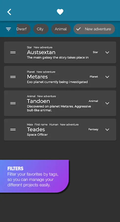 If you have found your perfect name, the fantasy name generator allows you to instantly save the name to your favorites list, where you can manage your favorites by adding tags and comments, for easy filtering. Edit your names, if the generated name does not perfectly fit your purpose or copy them to your clipboard to share them with friends.