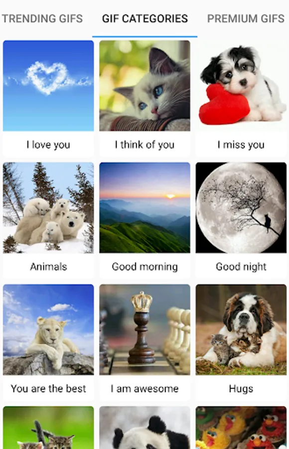 - handy categories: Good morning, How are you, I miss you, I love you, Happy Birthday...