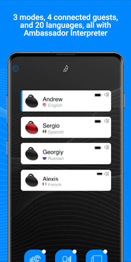 • Lecture - Ideal for groups and conferences, set your Ambassador to translate everything you say and stream it through your smartphone’s loudspeaker or a paired audio system for your audience.