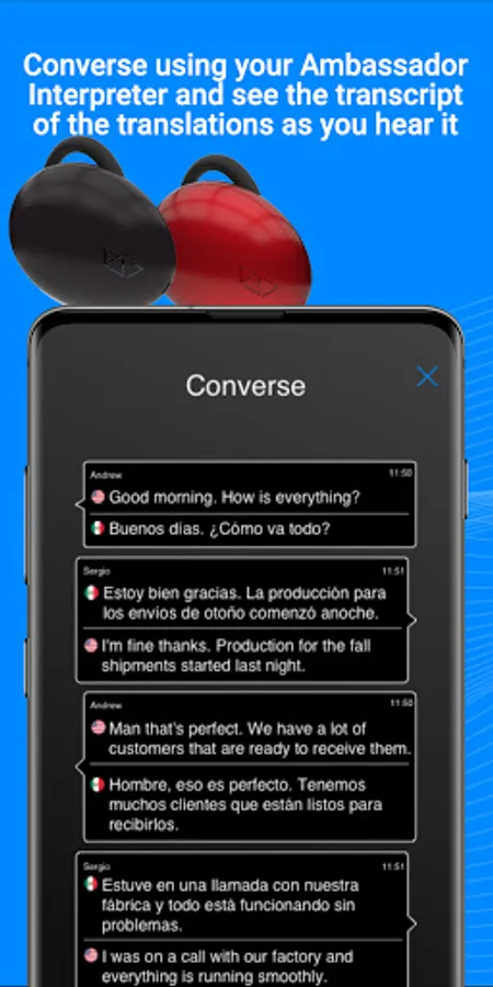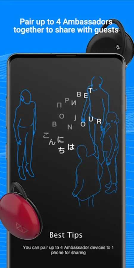 • Converse - Simply share one of the Ambassador units with your guest so you can both understand and communicate in your native languages. Pair up to 4 units to your smartphone for a smooth sharing experience.