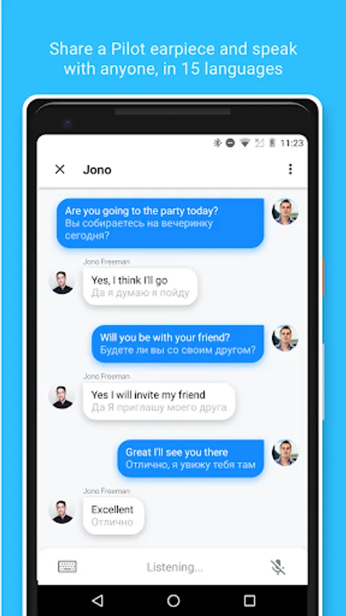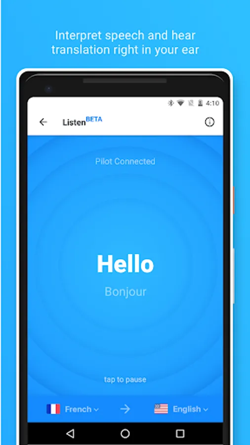 • Listen Mode: Use Pilot Earpiece to interpret your speech back to you in your choice of languages.