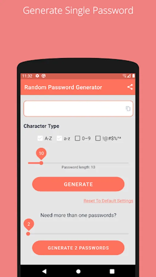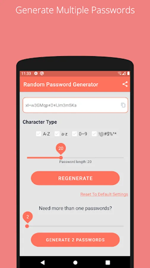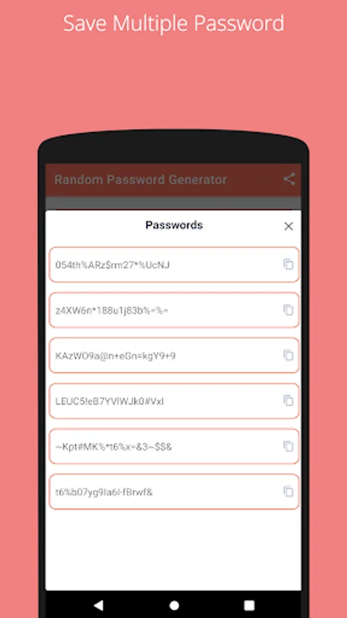 Get a secure and random password. All passwords are securely generated on your device only and are never sent across the internet!