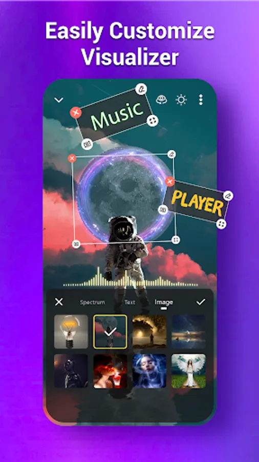 ▪️ Personalized music visualizer with many advanced features like adding text, your photo from the gallery, changing color, customizing Audio Spectrum,...