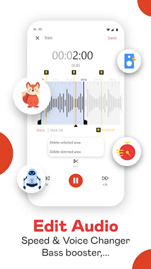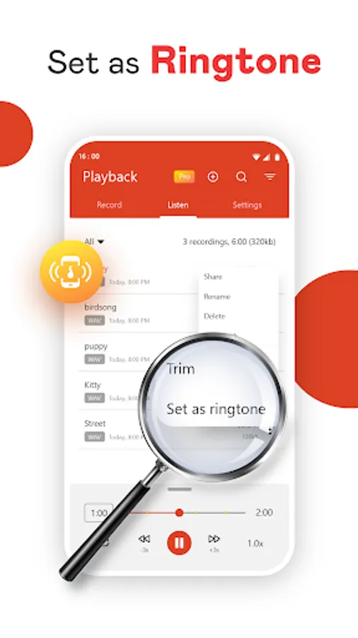 ★ Set recording as personalized ringtone, default ringtone, notification, or alarm.