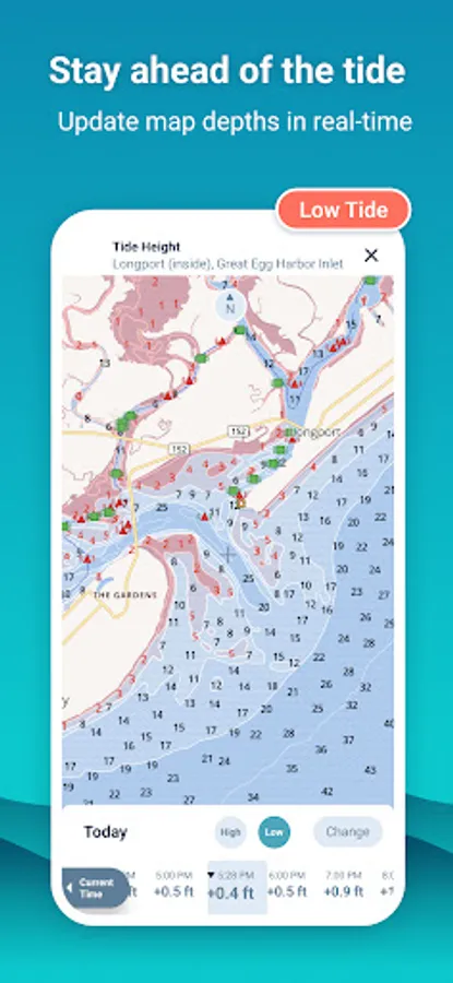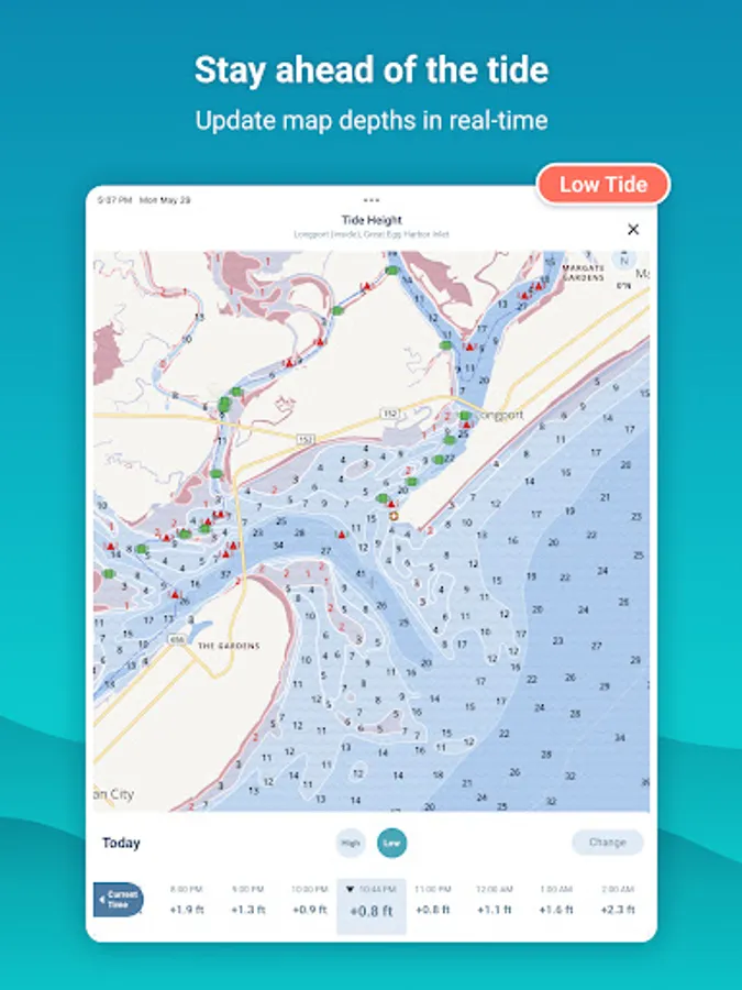 The Wavve Boating map automatically adjusts to display current water levels based on tide charts and tidal changes in a particular area of water. You can view hourly tide level changes up to 3 days in advance. Wavve takes the stress out of high and low tide.