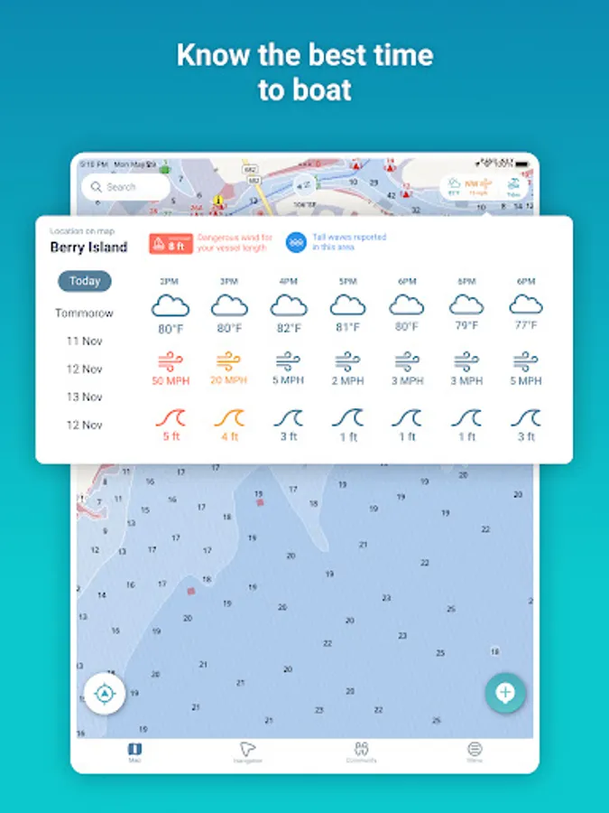 When it comes to marine navigation, and staying informed on current boating conditions, such as marine weather, wave heights, water depths, and tide changes, the Wavve Boating GPS is the most convenient choice. The Wavve Boating app takes a new spin on outdated marine navigation apps, tide charts, and chart plotters by combining all of the same functions and more into one easy-to-use tool.