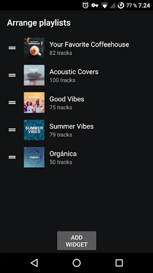 - Some low-spec phones might have trouble opening a playlist sometimes. The widget instructs to open a playlist. If that instruction doesn't reach the spotify app for whatever reason, there's not much I can do about it.