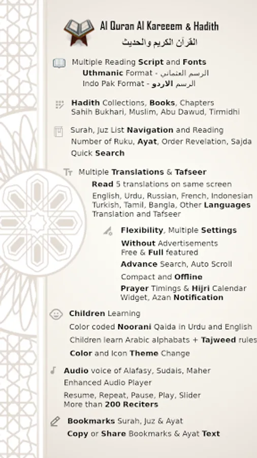 Al Quran Al Kareem and Hadith - القرآن والحديث is free full featured app that does not require internet to read Holy Quraan and Hadith books.