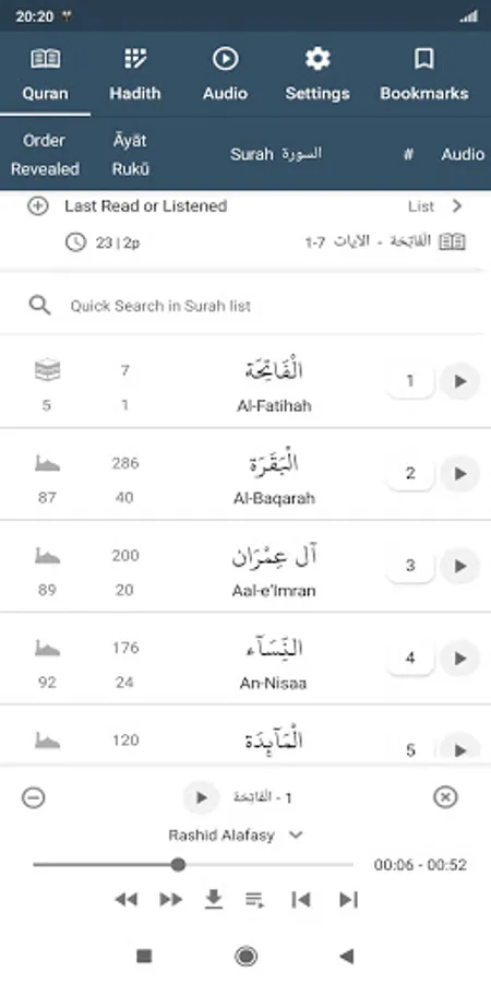 o Continue Last Read and Listen Surah