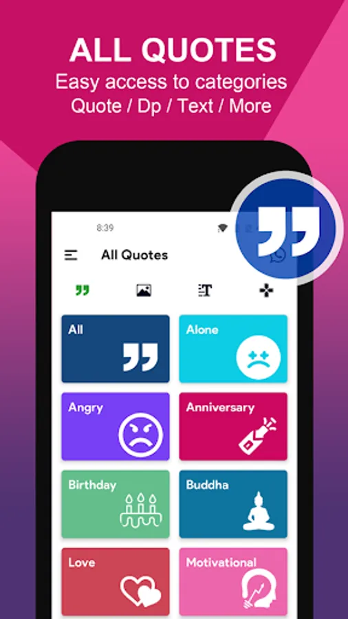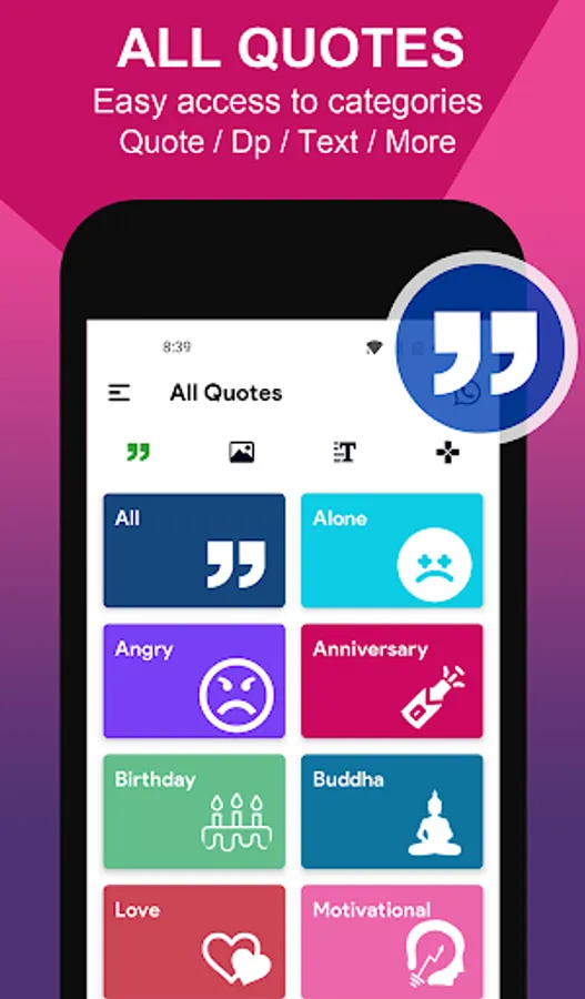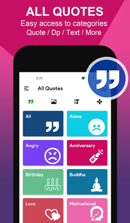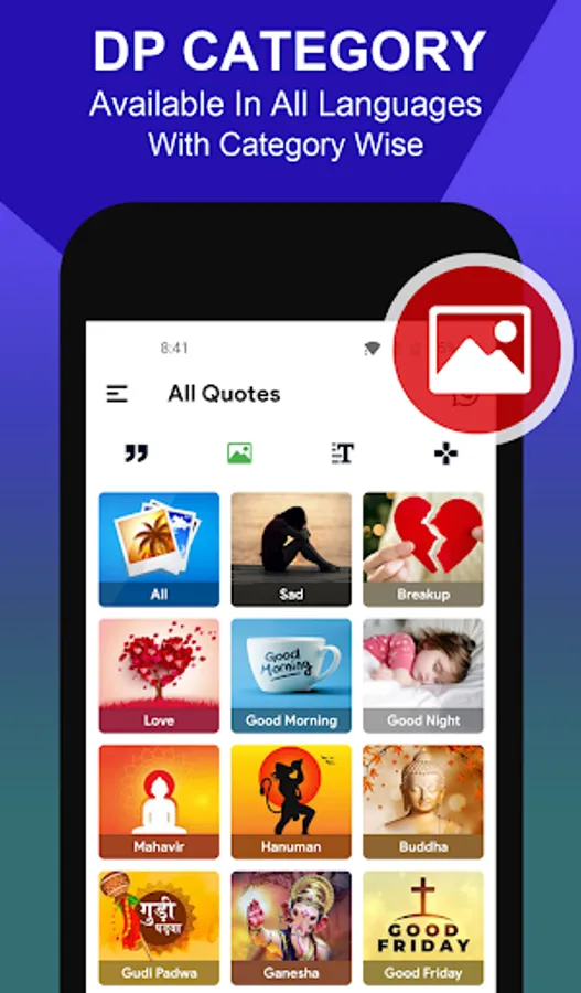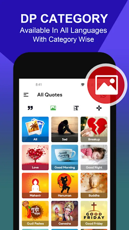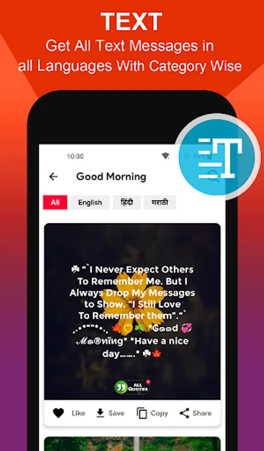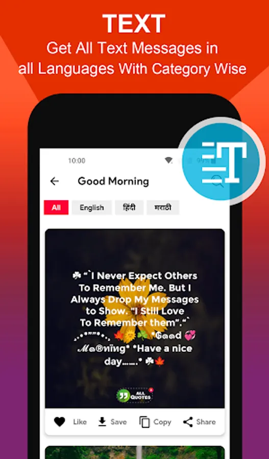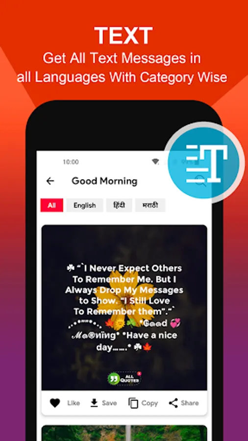 Wants to give lovely and memorial wishes to your friends through text messages? You are absolutely at the right place. All Quotes and Status has a widest new range of 50,000+ Text messages in 100+ categories and in multiple languages. You can also set backgrounds as per your mood. So Now Share a New trending collection of Messages & Status to a friend and family and let them know you care and that you’re thinking of them on their special day.