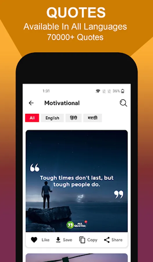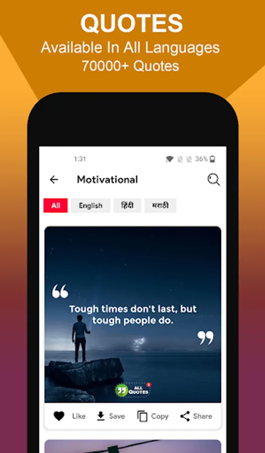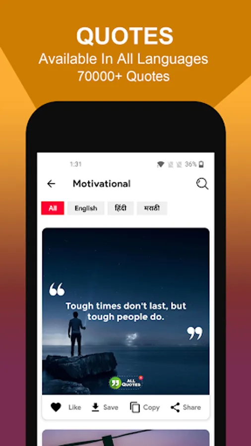 There are more than 300+ categories and more than 1,00,000+ Quotes with multiple languages in this application.