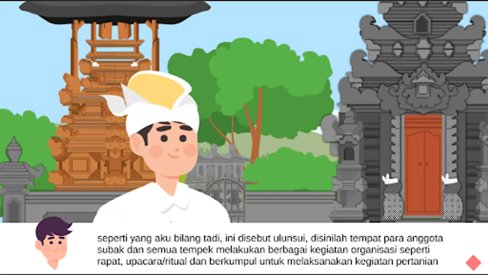 You will play the role of Ihsan, a curious boy who is obsessed with Bali's Subak traditions and cultural uniqueness. Learning why Subak Bali is recognized as a world heritage is Ihsan's main goal. Fortunately, he is not alone in his adventures. He is assisted by a local guide experienced in the tradition, named Yogi.