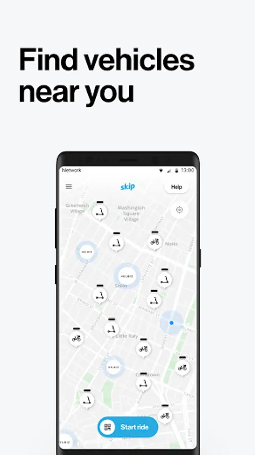 How it works: Find a Skip scooter on the corner, scan it with the app, flip up the kickstand and go! Ride your electric powered Skip scooter on city bike paths and roadways. When you're done, instantly end your trip by parking your scooter on the sidewalk and completing the ride in the app. No docks or locking required.