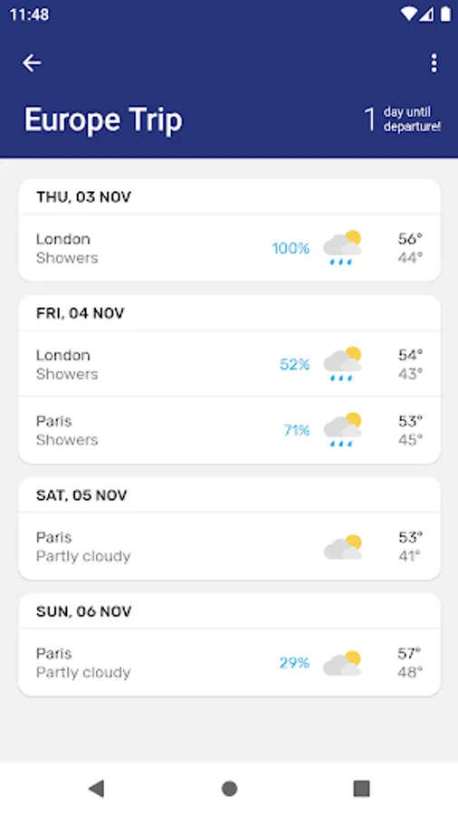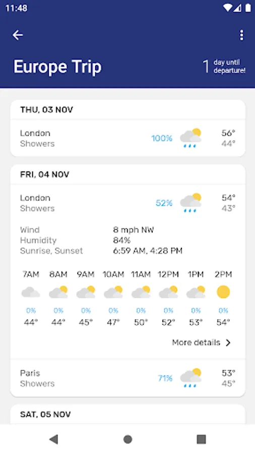 Create your own trip itinerary with any number of days and destinations and get a customized daily and hourly weather forecast. The trip will be saved in the app so you can come back for an updated forecast anytime before and during your travels. The Waycast weather app is especially helpful for multi-destination trips, like road trips or backpacking, eliminating the need to do separate weather searches for each destination along the way. Build your trip once on Waycast, and all the weather data for your journey will be in one place!