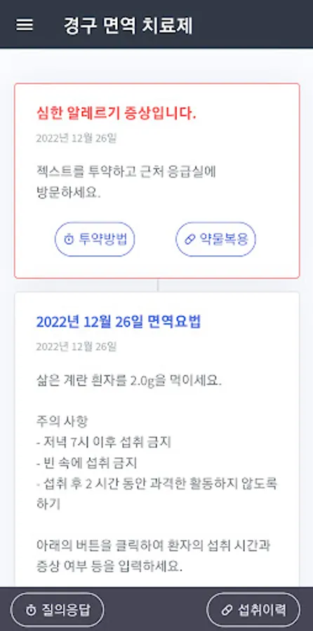 Based on the medical information of the food allergy patient who visited the hospital, a protocol for oral immunotherapy is provided according to the prescription of the medical staff, and the protocol searches for allergic reactions through this application, manages the schedule accordingly, and monitors it by the medical staff. To verify clinical application and effectiveness of oral immunotherapy protocol for allergy and schedule management protocol according to allergic reaction