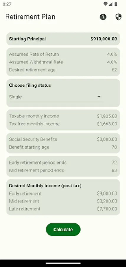 While the app is not a guarantee that you will have enough money for retirement, it is a great tool to forecast the amount of money you will have available throughout your retirement. It allows you to take an initial starting principal and input variables like assumed return rates and withdrawal rates and uses the current IRS tax tables to forecast your post-tax income each year.