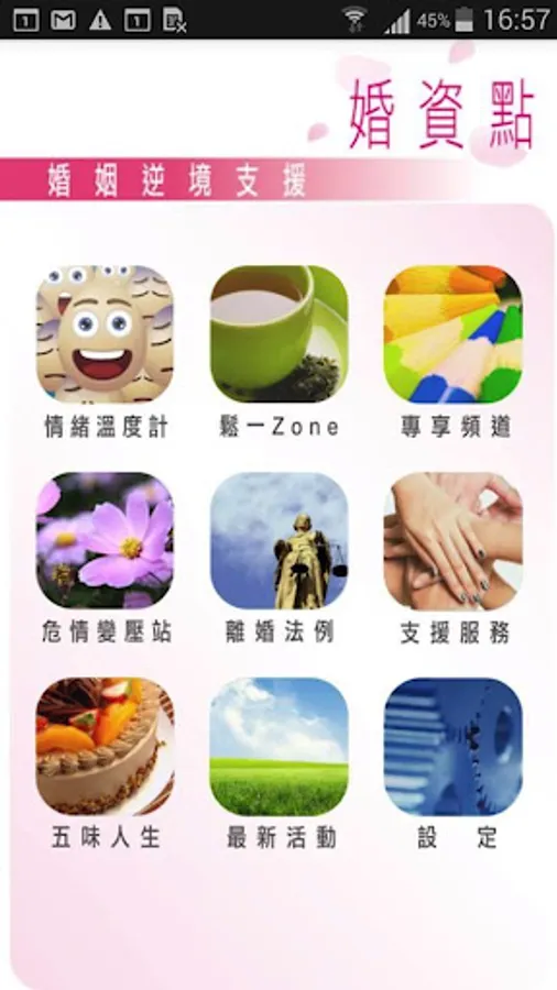 本應用程式由香港基督教女青年會開發,內容包括:抑鬱及壓力測試、身心鬆弛練習、離婚法例、婚姻危機夫婦及親友的處理方法、專家文章分享、過來人分享、支援服務資料以及最新活動資料。