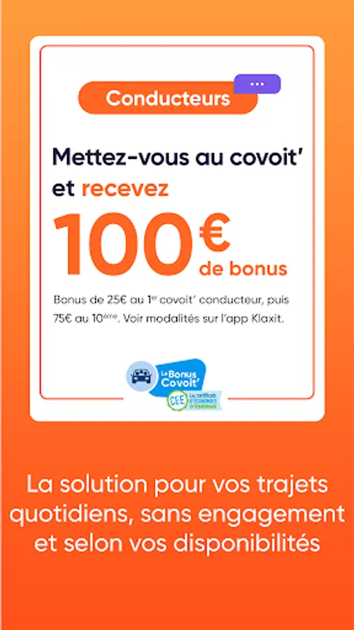 • Make your journeys profitable: get an average of €120 per month with a guaranteed minimum remuneration for each journey and a bonus of €100 to celebrate your first rides (depending on eligibility),