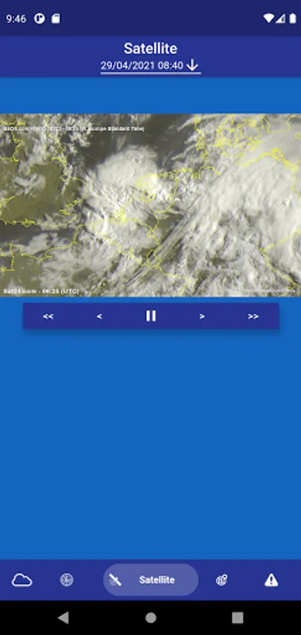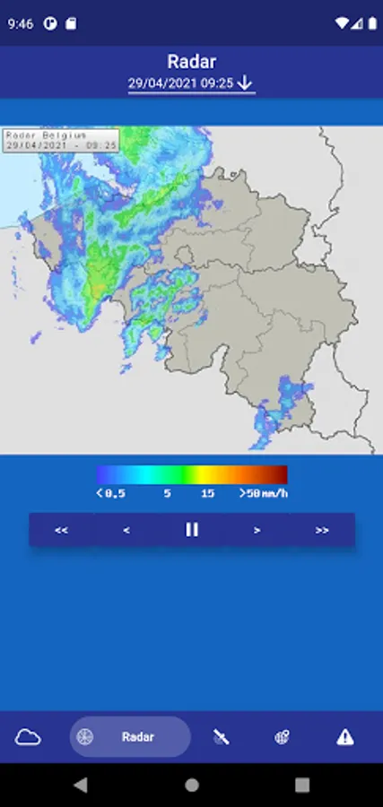 Observeer de neerslagactiviteit op de radar om de tussenliggende afstand te kunnen inschatten tot de plaats waar u zich bevindt. Bewegende satelietbeelden in stappen van 5 minuten!