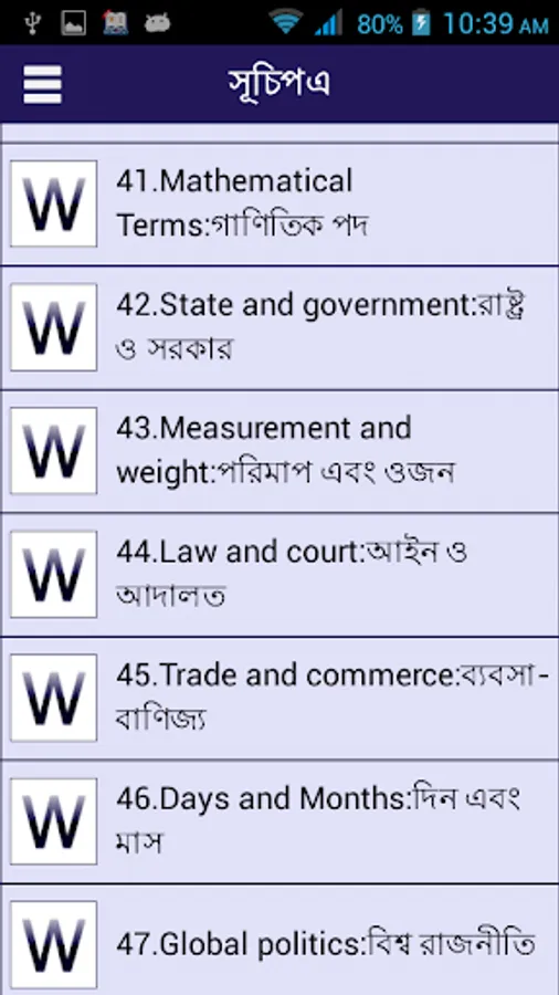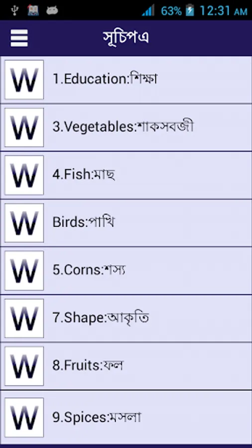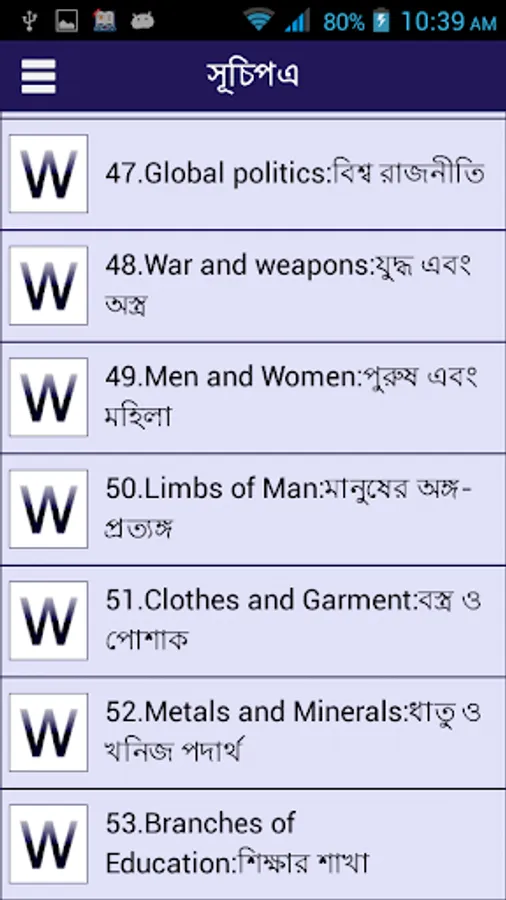 This English to bangla words book you can use as a small English to bangla or Bengali or Bangla to English Dictionary or Mini or micro English to bangla or Bengali dictionary. This application also help to kid or kids to learn simple English to bangla words . Not only kids but also all Bengali native people can this words book. By using this words books you can make English to Bangla Translation usually.