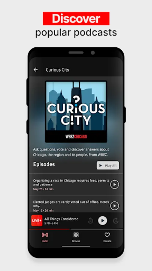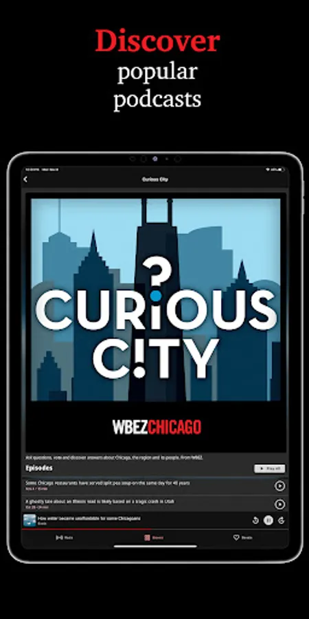 Discover something new. Browse through the best audio stories and shows WBEZ Chicago has to offer. Each day, featured stories are curated just for you from our newsroom. Plus, you can find popular podcasts from WBEZ, NPR and other featured partners; including titles such as Curious City, Nerdette, Motive and Wait Wait...Don’t Tell Me! There’s something for everyone with the WBEZ app.