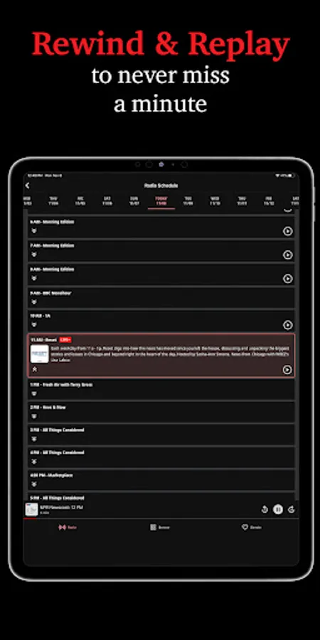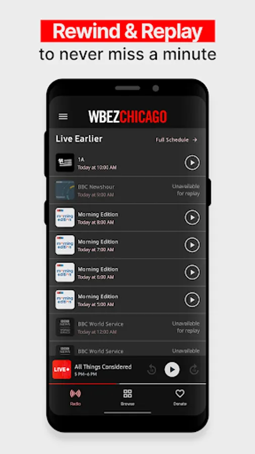 You never have to miss a minute again. You can rewind at any moment and replay any live show from the last week to catch up on anything you missed. With the WBEZ app, continue to get investigative journalism, cultural reporting, news headlines and more on your timeline.