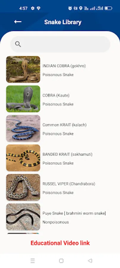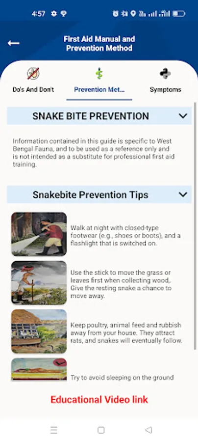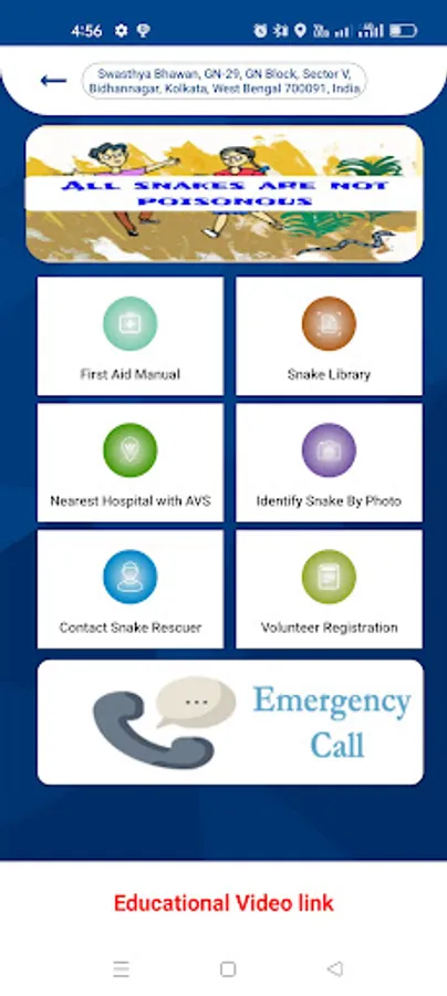 The app intends to reduce the mortality and morbidity from Snake bites by spreading awareness among people.Apart from the first aid, signs and symptoms, and snake-related information, it helps people to navigate to the nearest government hospital having antivenoms by GPS tracking. It contains the phone numbers of snake rescuers for rescuing the reptiles to maintain ecological balance