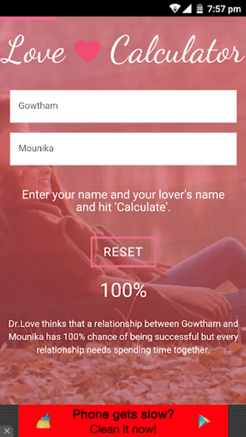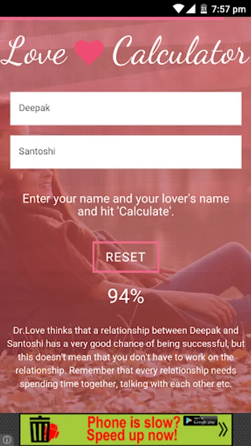 This Love Calculator was designed with a special algorithm to provide 95% accurate results. Formulas are created by Dr. William which proven 90% accurate when tested among 500+ Couples and other formula was created by Dr. Sigrun with 87% accuracy. I used these both formulas and created a new server which could answer with 95% accuracy.