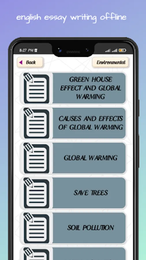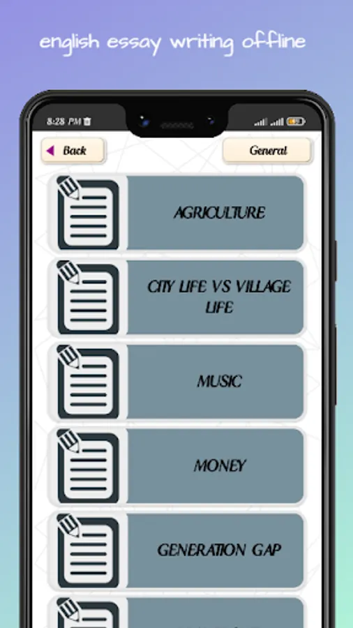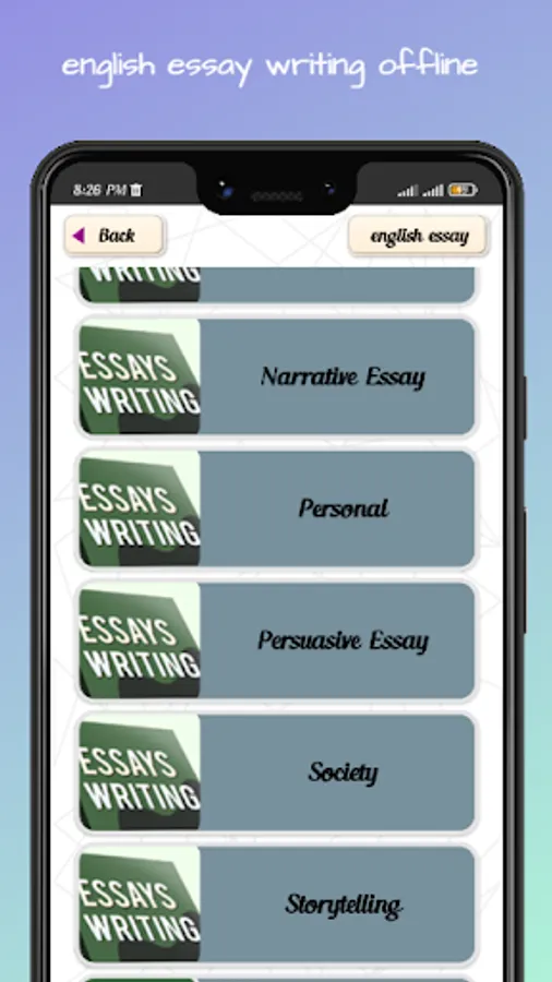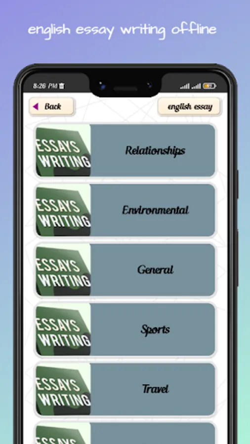 English essay writing book is an offline book. This book has many english essay writing tips for english essay book for class 12 offline and other essay book in english. it has various type of categories and huge english essays collection offline for english essays and Fully Offline app.