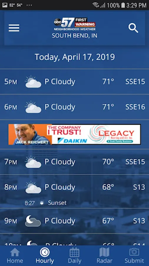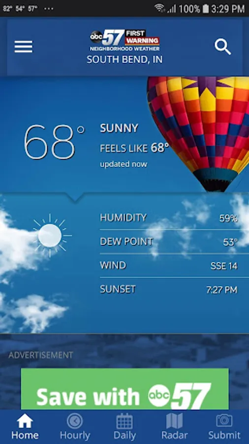 ABC57 First Warning Neighborhood Weather's redesigned app puts the expertise of all five of ABC 57’s meteorologists in your phone or tablet. Whether you've lived in Michiana a day or a lifetime, one thing is certain – Indiana and Michigan weather can change by the hour. Our app was designed to let you see our video forecasts and to use our weather tools to plan your day or night.