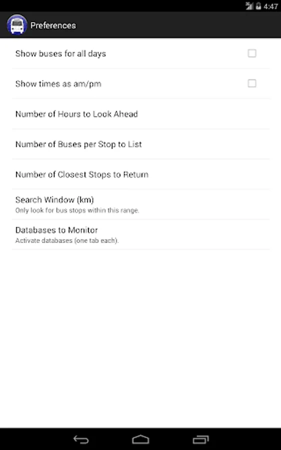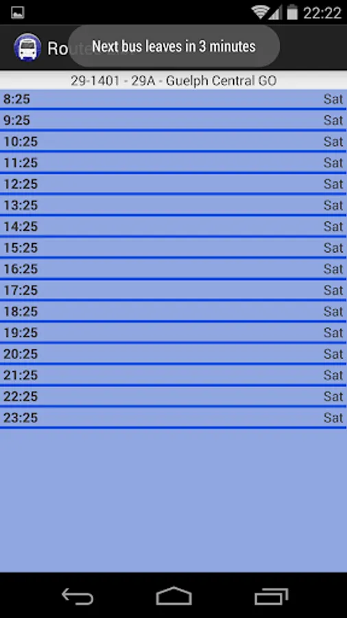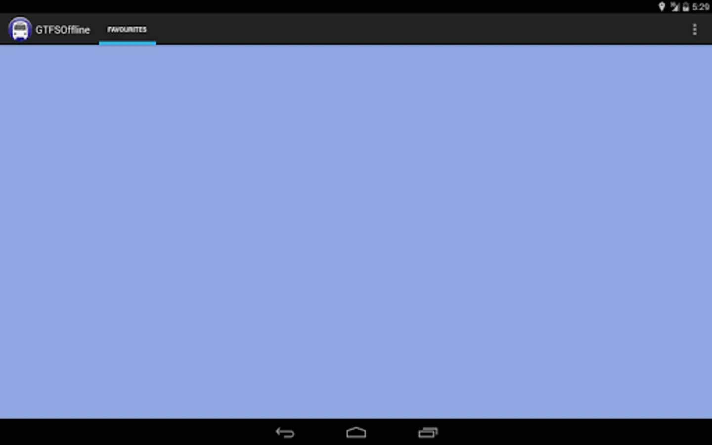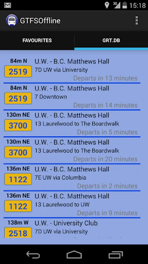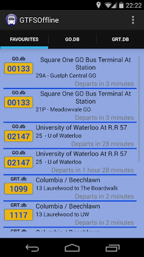 The app supports an unlimited number of these databases, and it will use the current GPS lock to find the nearest bus stops and bus times. A long-press on any of these bus stops will save them in a favourites tab.