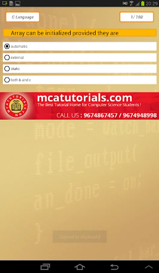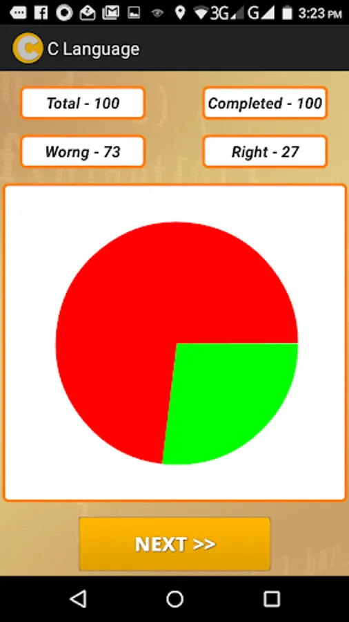 At the end of session , it displays the results with a PIE graph. You can share this result with your friends. If you want to learn more about the subject, the App also has tutorials for FREE. This is a comprehensive tool that prepares you for the C Language Exam.