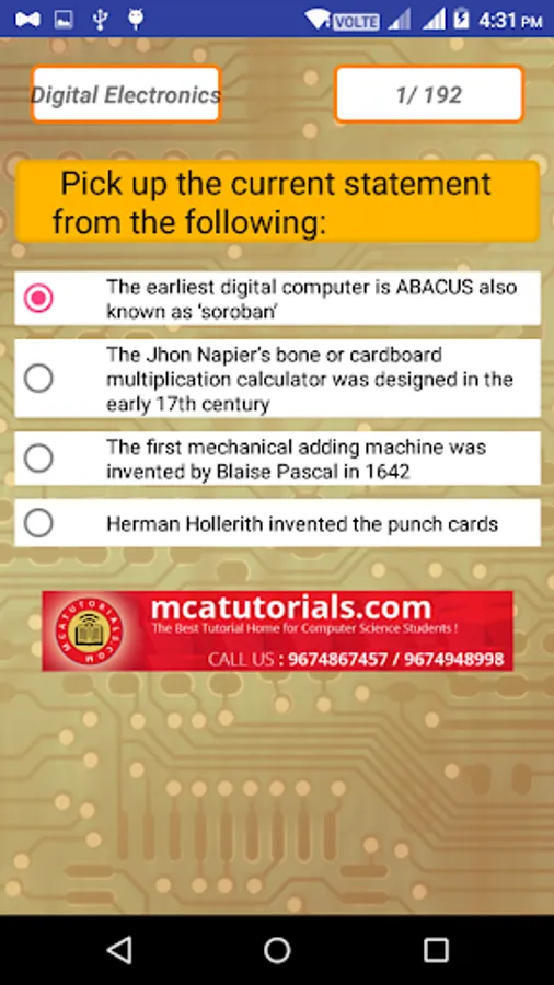 This App Helps the students to prepare themselves for the Exams. Every Question has 4 options . You have to choose the right one. There is no time limit. If you have chosen the right Answer , it will show you the option that you choose in green color and move to the next question. If you have chosen the WRONG answer, it displays your choice in RED and then the RIGHT Option in GREEN. This helps you to know the right answer for the question and to remember it for the exam.