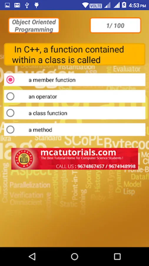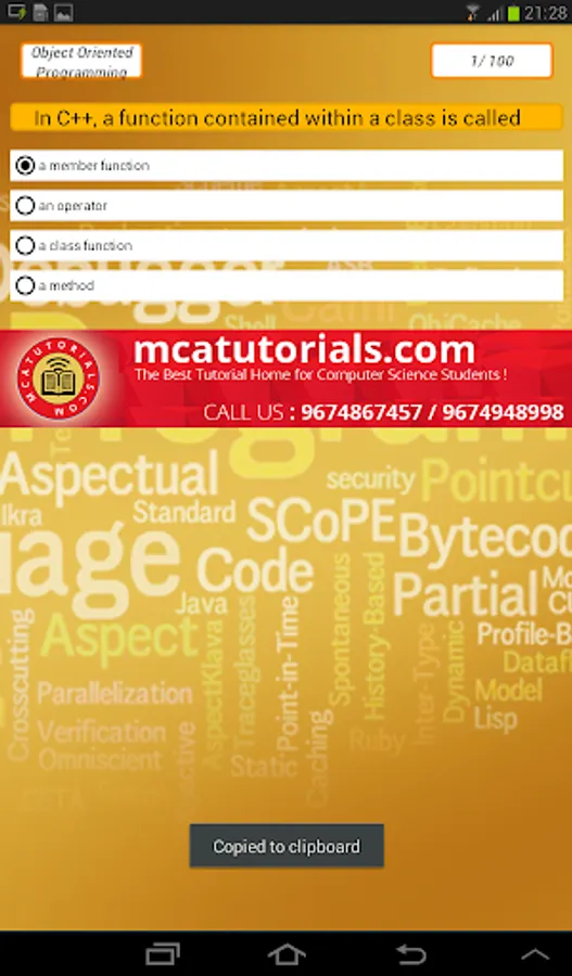 Object Oriented Programming Question and Answers - This Application is very useful for the students who are learning Object Oriented Programming and preparing for CAMPUS INTERVIEWS. As you know, now a days in every Competitive exams , Multiple Choice questions are there. This App has 100 Multiple Choice questions along with their correct answers. These question are frequents asked in Exams like GATE , NET and SLATE.