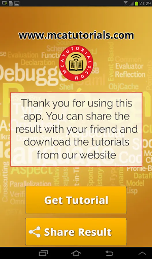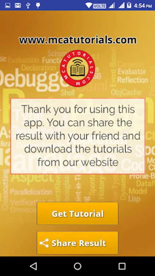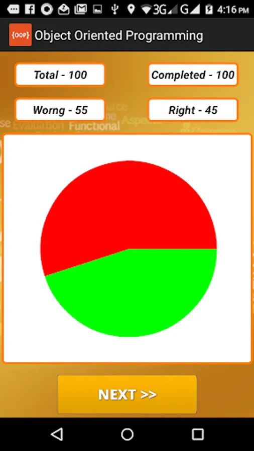 At the end of session , it displays the results with a PIE graph. You can share this result with your friends. If you want to learn more about the subject, the App also has tutorials for FREE. This is a comprehensive tool that prepares you for the Object Oriented Programming Exam.