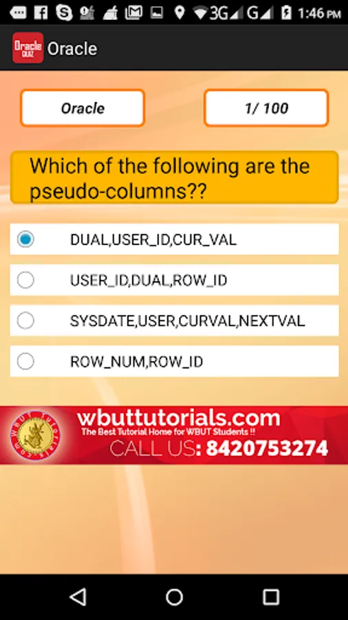 Oracle Question and Answers - This Application is very useful for the students who are learning Oracle and preparing for CAMPUS INTERVIEWS. As you know, now a days in every Competitive exams , Multiple Choice questions are there. This App has 100 Multiple Choice questions along with their correct answers. These question are frequents asked in Exams like GATE , NET and SLATE.