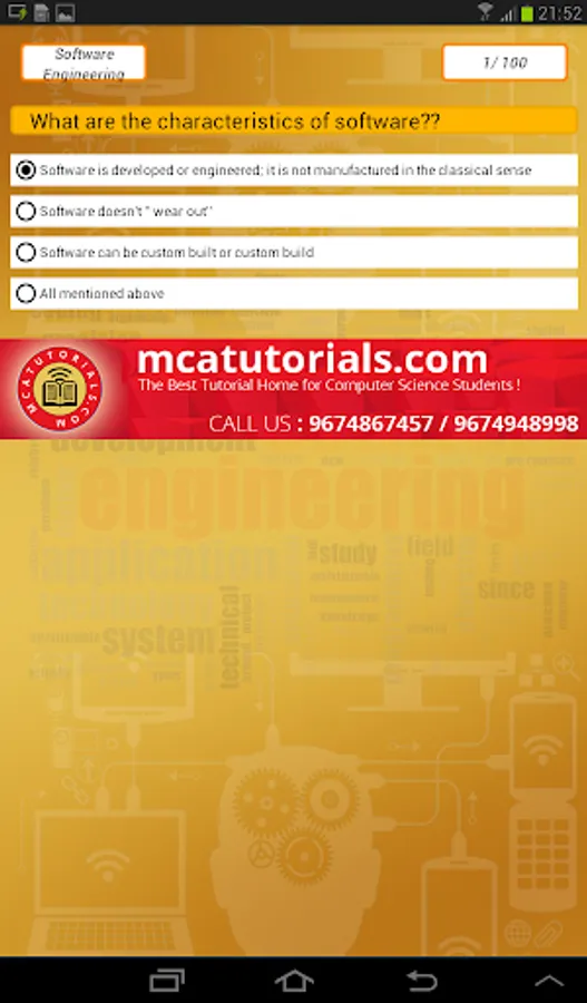 Software Engineering Question and Answers - This Application is very useful for the students who are learning Software Engineering and preparing for CAMPUS INTERVIEWS. As you know, now a days in every Competitive exams , Multiple Choice questions are there. This App has 100 Multiple Choice questions along with their correct answers. These question are frequents asked in Exams like GATE , NET and SLATE.