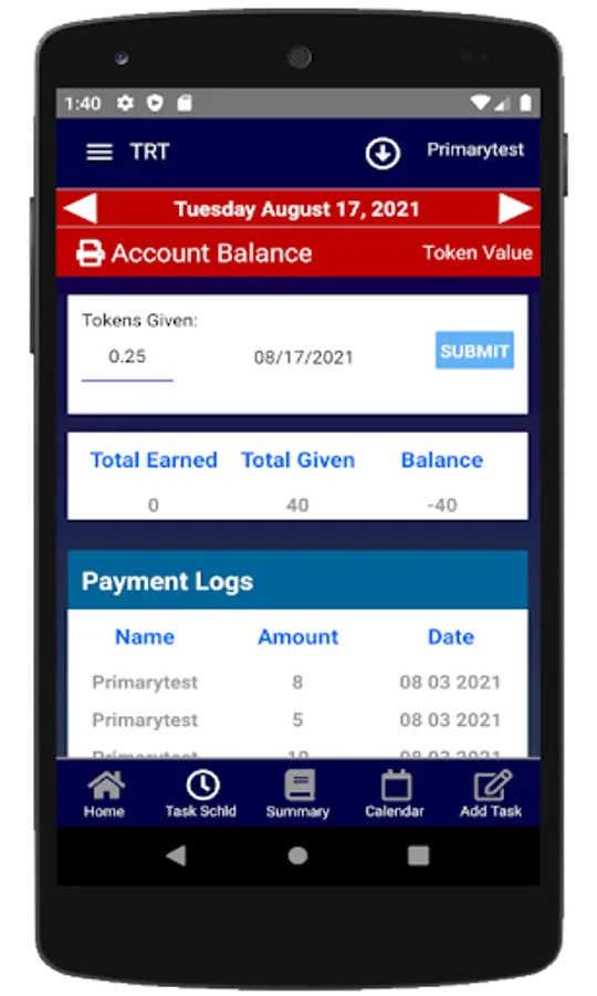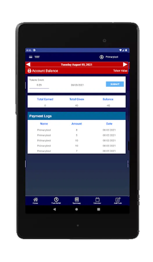 This is a task tacker and chore App with the capability to assign tokens (rewards) to each task. The Primary User (eg parent) can add tasks (chores) and rewards for Others (eg Dependents). The individual tasks can have different values. Chores can be assigned and tracked for the whole family by the Parent. The total value of tasks completed are accumulated and can be paid at any time. A balance is always kept and Tokens can be given a value, eg one token equals 10 cents, or you can convert tokens to something else, eg video play time.