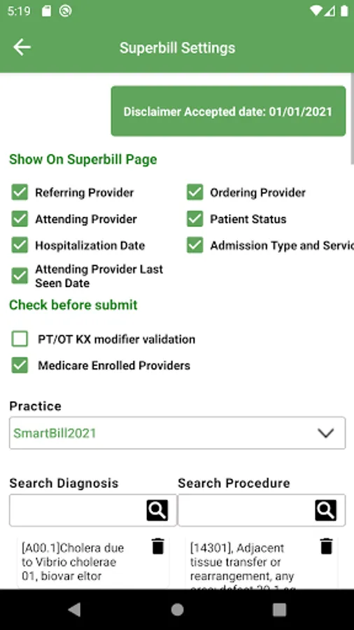 In case of missing procedures or diagnosis codes on Electronic superbill form, provider always can add them through superbill settings. During creating electronic superbill providers can add additionally (to procedures) modifiers, units, make notes, add patient authorization and eventually submit the electronic superbill.
