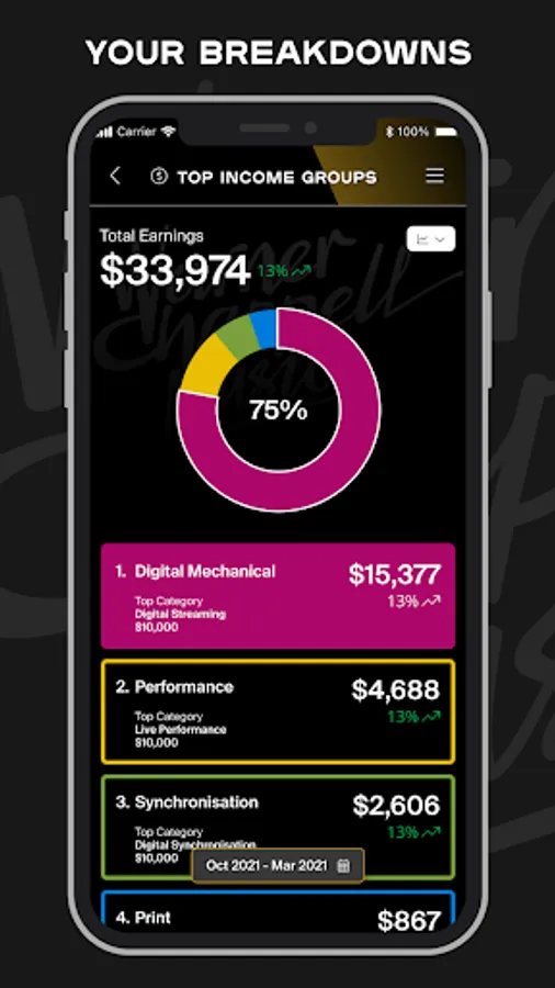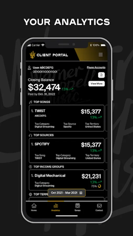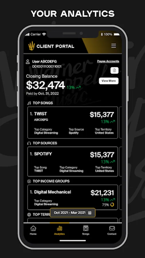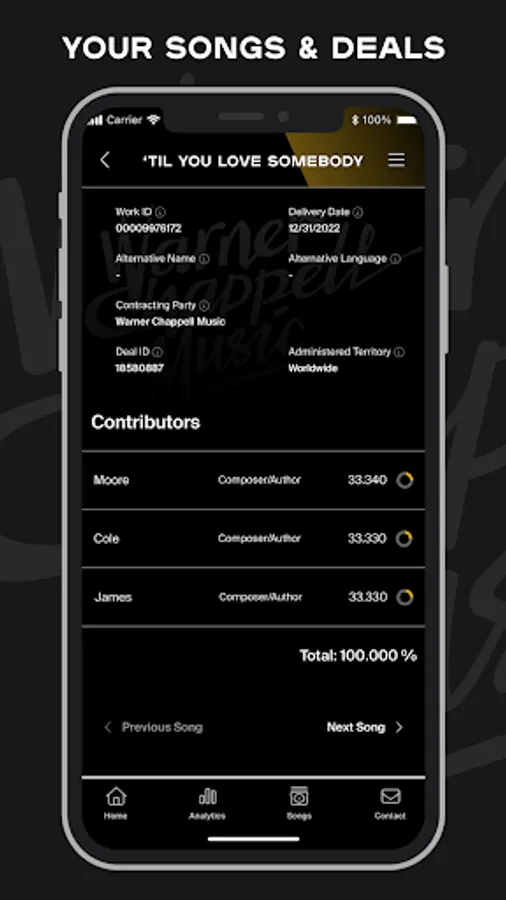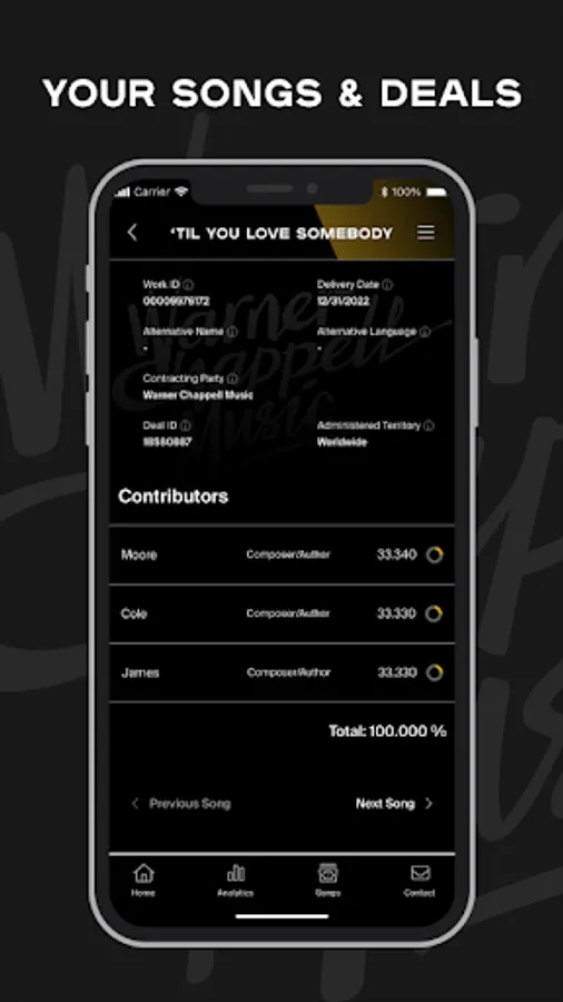 Warner Chappell Music (WCM)’s Client Portal provides songwriters and their management teams with an overview of their account and information related to deal(s), songs, royalties earned per pay period, analytics data (top songs, top sources, income types, territories) and statements.