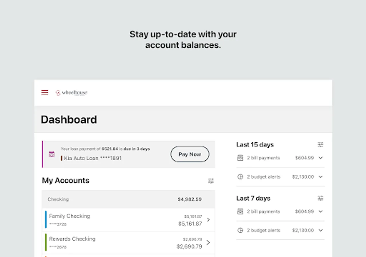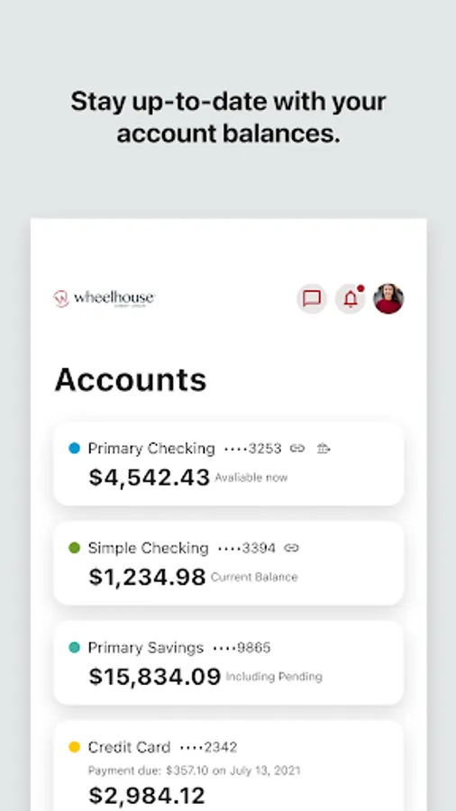 Welcome to Wheelhouse! This mobile app was designed with our members in mind. It allows you to view your entire financial picture, including any accounts you may have from other financial institutions. Manage your finances anywhere and anytime... all on your terms. Other features include:
