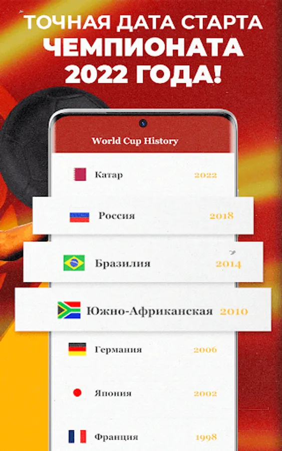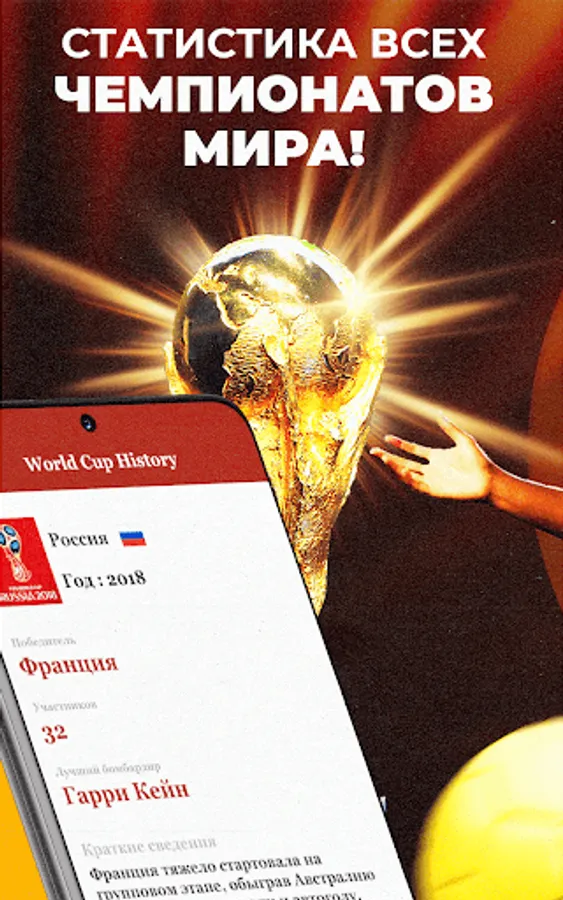 Стилизованный и удобный дизайн от бк олимп, простой интерфейс, таймер в реальном времени - все это уже есть в приложении. Устанавливайте World Cup History сейчас совершенно бесплатно!