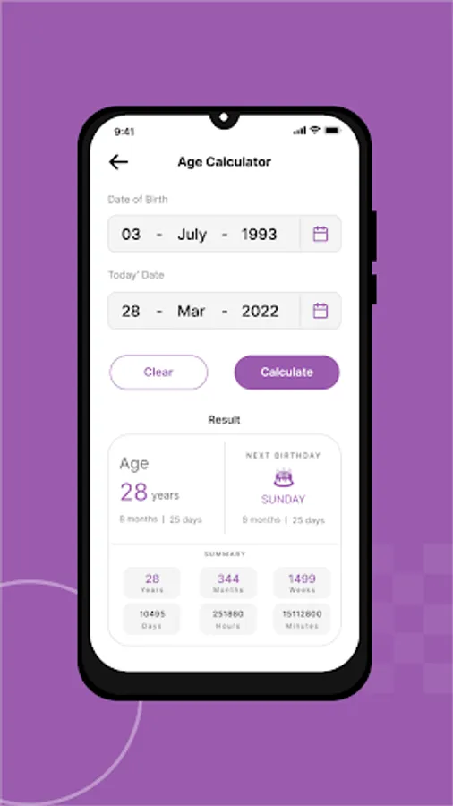 This age calculator app has been designed to calculate your current age based on the input provided in the 'Date of Birth' field. Alternatively, you can enter a date of your date of birth and today's date in the field to know your age at that particular point in time.