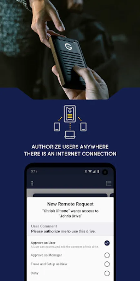 Easily control who gets access to your drive whether they are in-person or remote. When you’re in-person, simply use the app to grant the user access. A new remote user will need to have the drive, the app, and an internet connection to request access approval from the drive’s manager, which is granted via email or messaging service.