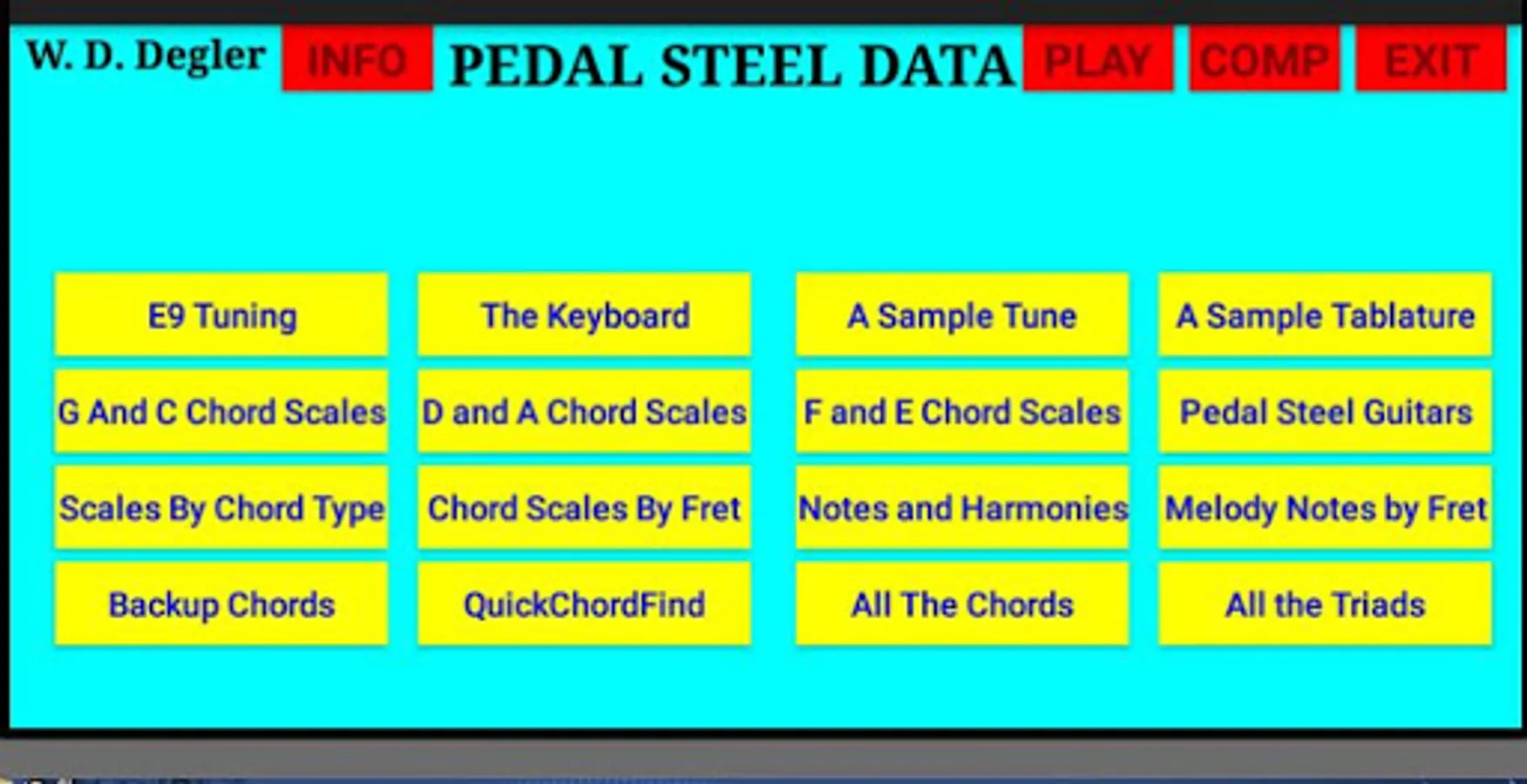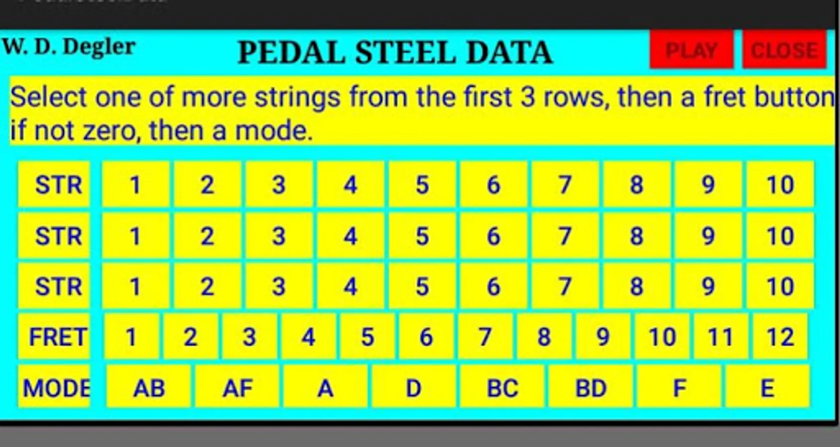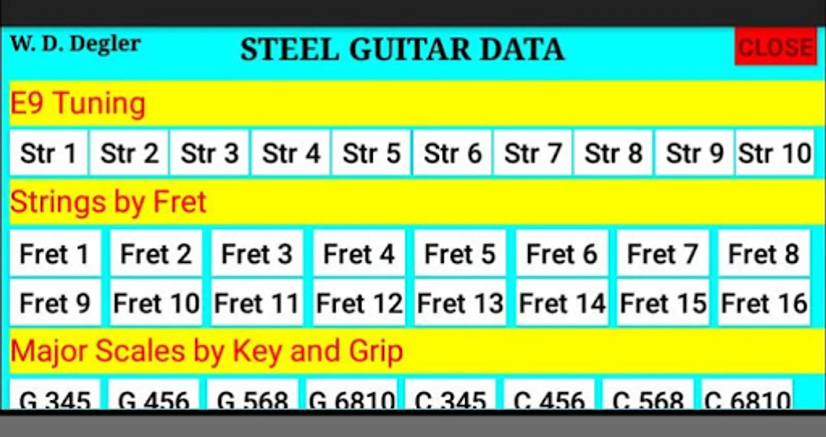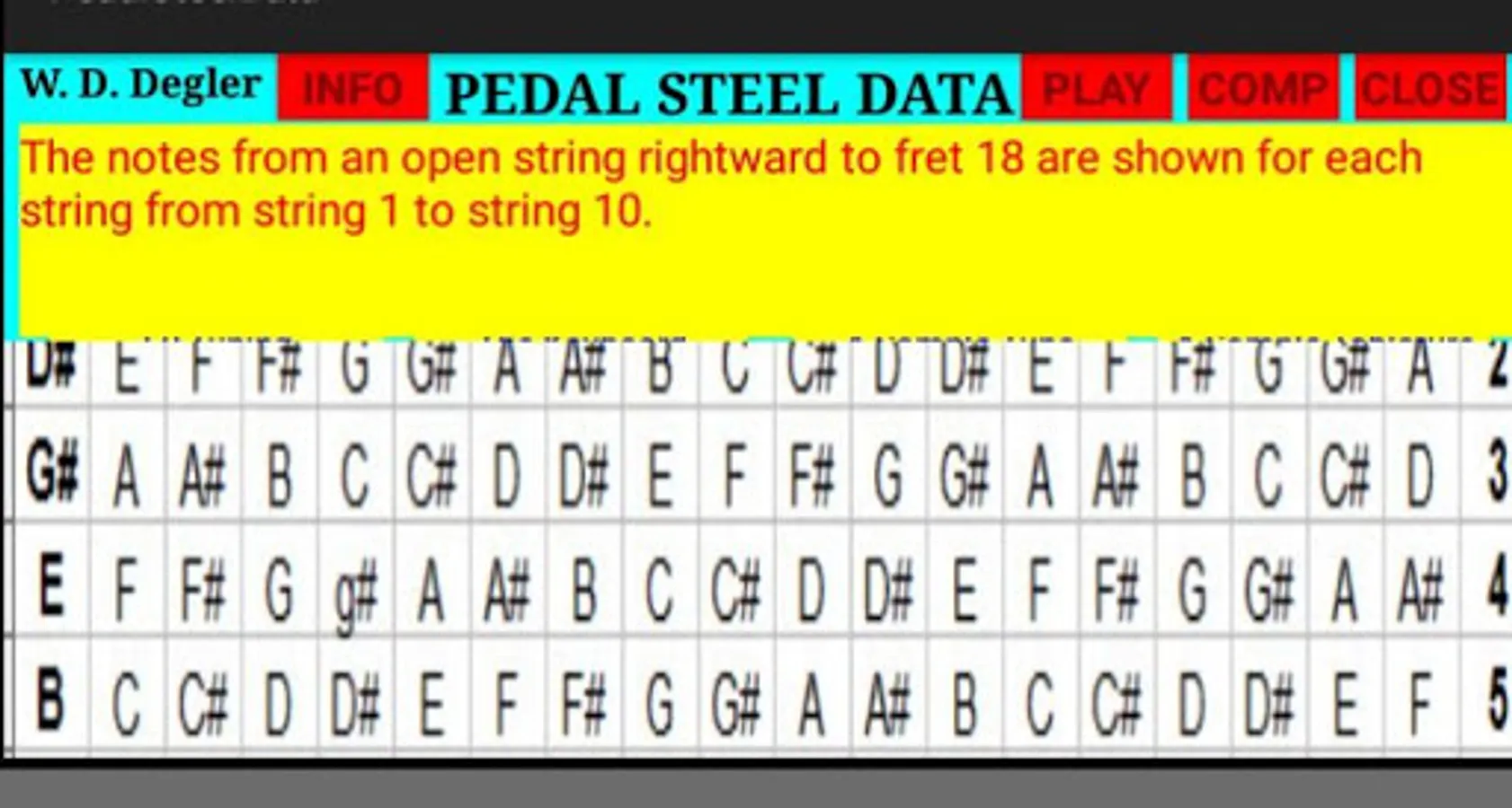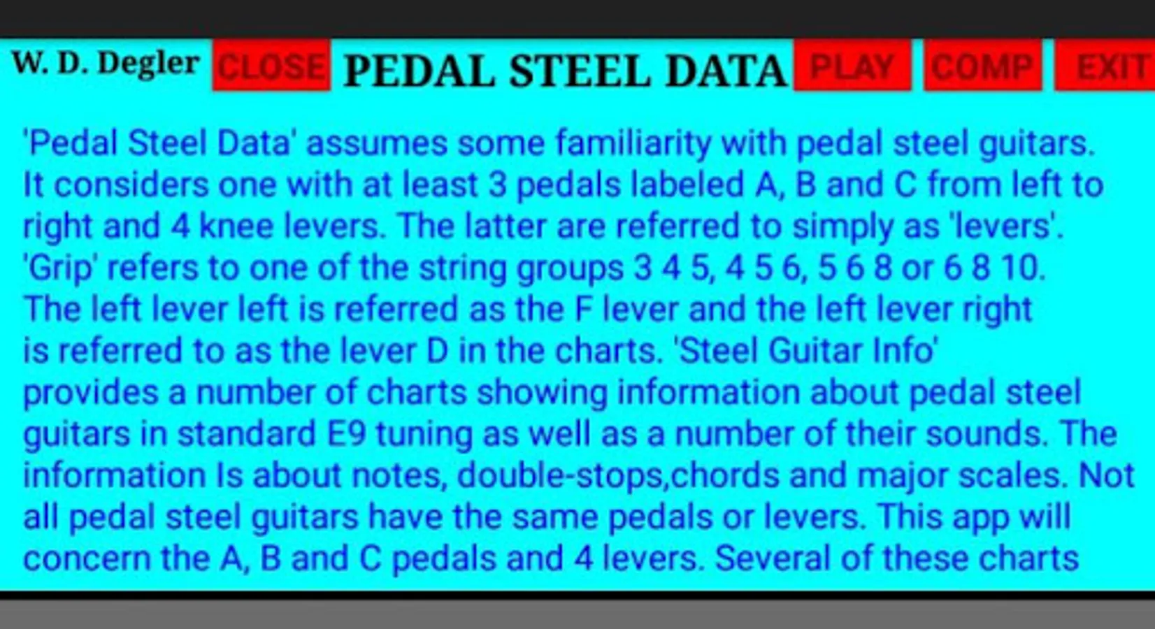 Pedal Steel Data" is an app about pedal steel guitars in the popular E9 tuning. Several charts present information about the tuning, pedal/knee lever actions, notes, harmonies (double-stops), chords and major scales in multiple ways. All of these can all be heard by selections of strings, frets, grips, pedals and knee levers. The pedals considered are pedals A, B and C with the standard actions. The (knee) levers considered are the left knee left (F) and left knee right (D). A detailed user guide is presented by selection of the "INFO" toggle button on the home screen.
