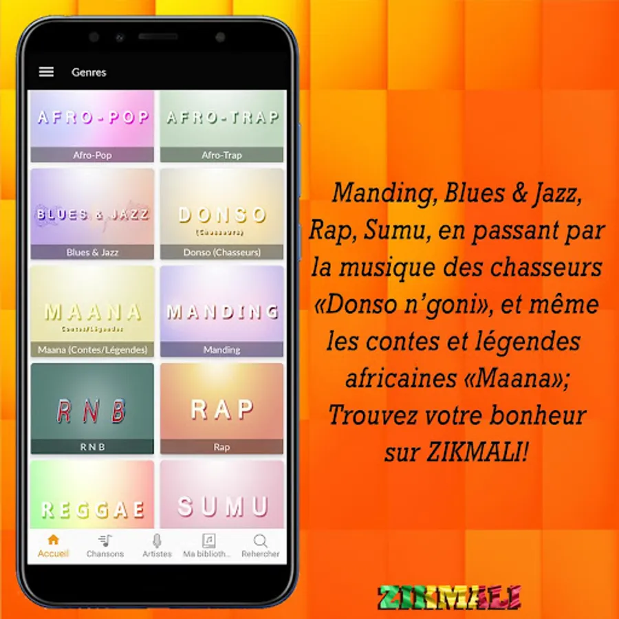 ZikMali réunit tous les genres musicaux du Mali dans une seule application : Mandingue, Afro-Pop, Blues & Jazz Traditionnel, Tradi-Moderne, Rap, Reggae, Takamba, Donso N'goni, Maana, Zikiri, Sumu... Pour tous les goûts