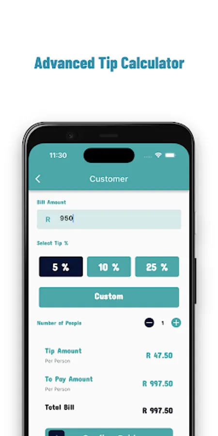 * Customers input the total bill amount and specify how they want to split it (equally, by percentage, or custom).