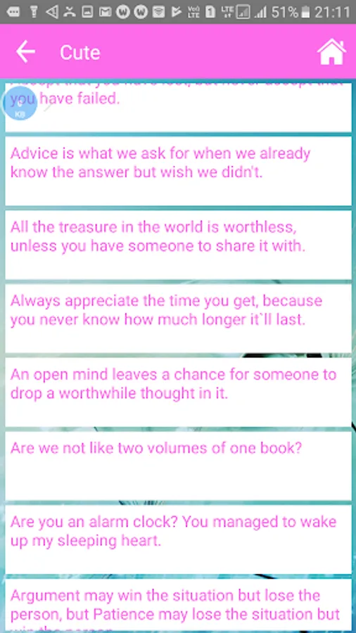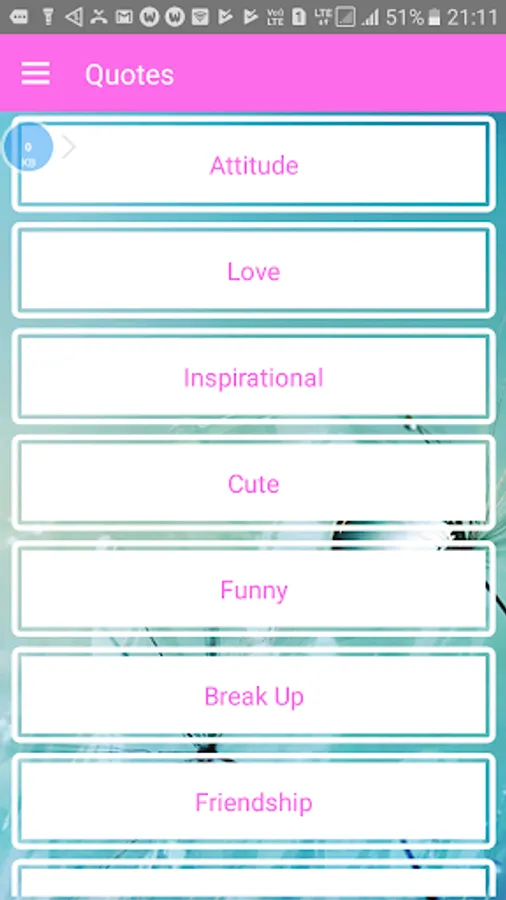 This Application Contain Status In Engluish Language.You can Browse Best Status From Following Categories1)ATTITUDE2)CLEAVER3)LOVE4)HAPPY_BIRTH_DAY5)HINDI6)MOTIVATIONAL7)LIFE8)ROMANTIC9)SAD10)NEW_STATUSFeatures:1)you can copy and share the text message.2)This app Offline.3)Easy to Share Status4)Easy to use application5)This Application Online/Offline available